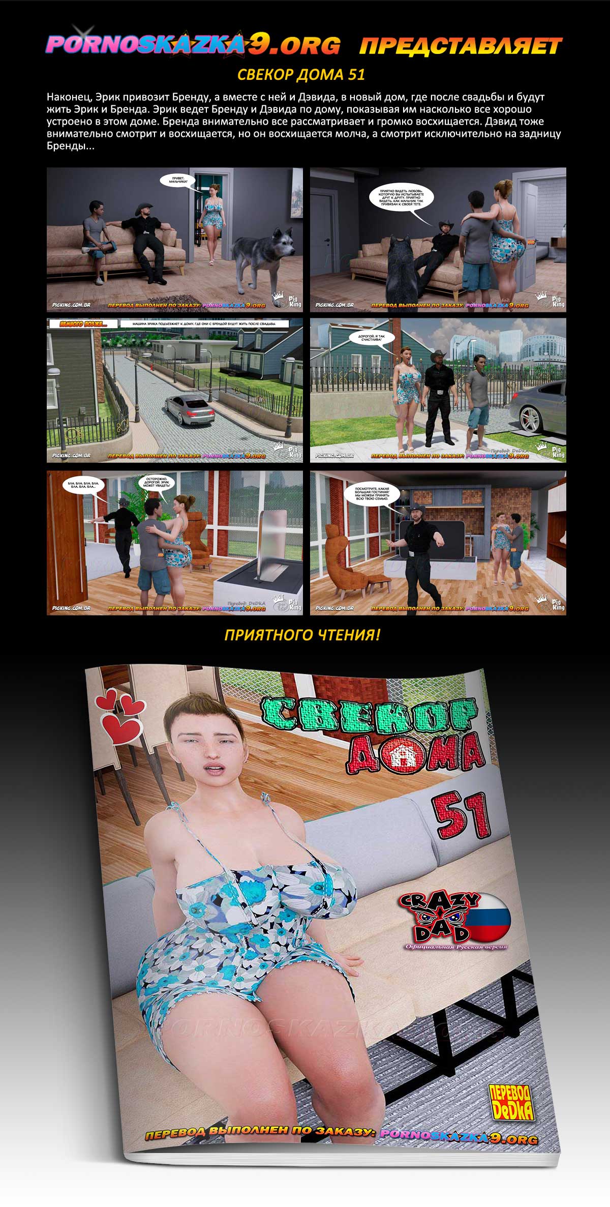 Порно комикс «Свёкор дома. Часть 51». Наконец, Эрик привозит Бренду, а вместе с ней и Дэвида, в новый дом, где после свадьбы и будут жить Эрик и Бренда. Эрик ведет Бренду и Дэвида по дому, показывая им насколько все хорошо устроено в этом доме. Бренда внимательно все рассматривает и громко восхищается. Дэвид тоже внимательно смотрит и восхищается, но он восхищается молча, а смотрит исключительно на задницу Бренды…